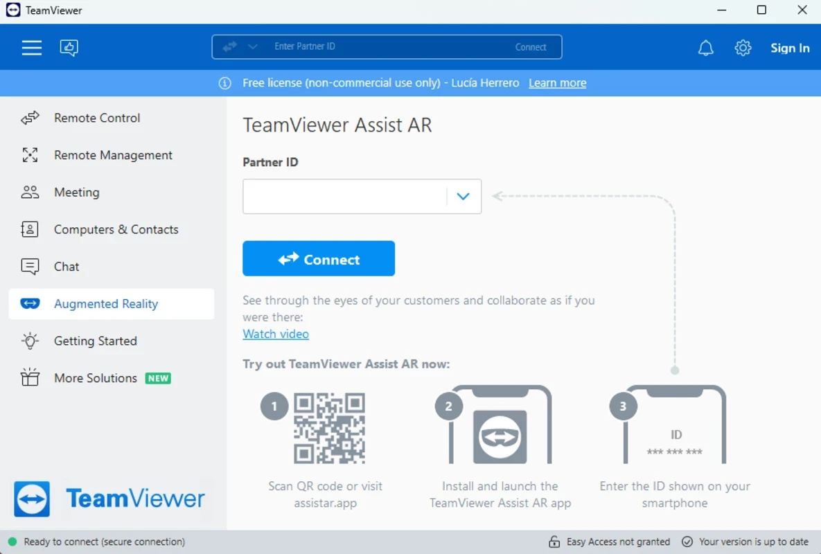 Intuicyjny interfejs oferuje proste i szybkie połączenie zdalne, ponieważ w lewym panelu bocznym znajdują się dodatkowe zakładki, takie jak Zdalne sterowanie, Zdalne zarządzanie, Spotkanie, Komputery i kontakty, Czat, Rzeczywistość rozszerzona oraz Rozpoczęcie pracy. Podczas łączenia się z innym systemem można wyświetlić pasek stanu, a spotkania można łatwo prowadzić, korzystając z zakładek takich jak Ekran główny, Akcje, Widok, Komunikacja oraz Pliki i dodatki w górnej części ekranu.